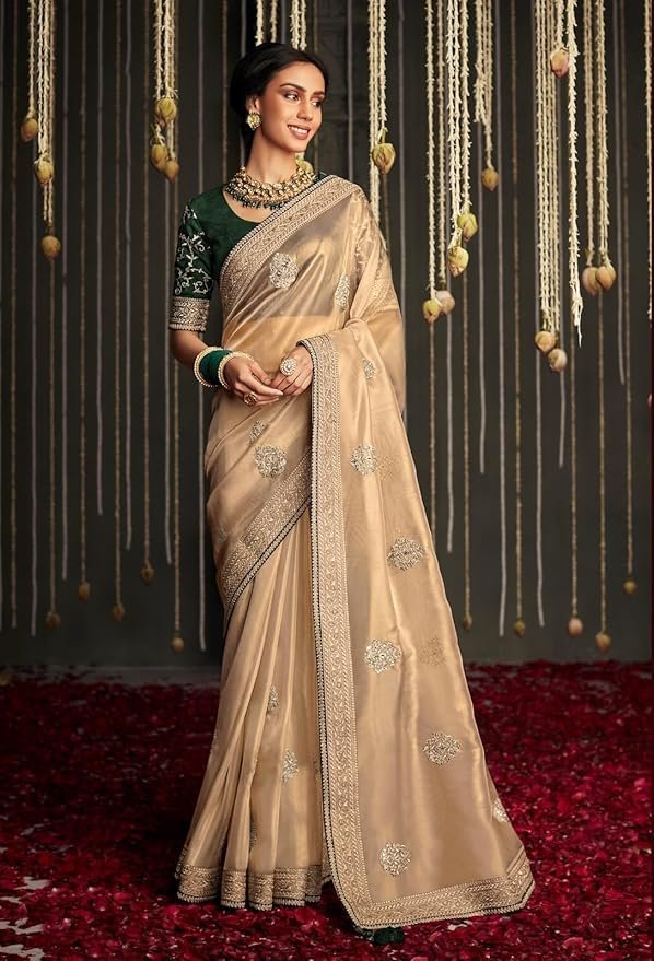 Shimmer Net Gold-coloured saree featuring an all-over heavy gold zari butta and sequence work on body decorated with border with contrast navy blue piping